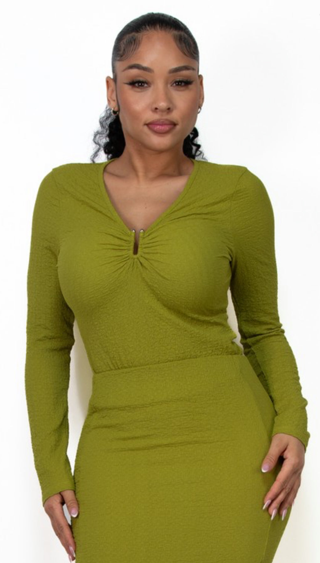 Elevate your wardrobe with our stunning AVOCADO GREEN 2 PIECE SKIRT SET, the perfect blend of style and comfort for Fall Fashion 2025. This figure-flattering TOP AND MIDI SKIRT features a stylish twist detail at the neckline and a daring side slit, making it an essential piece for any fashionista.